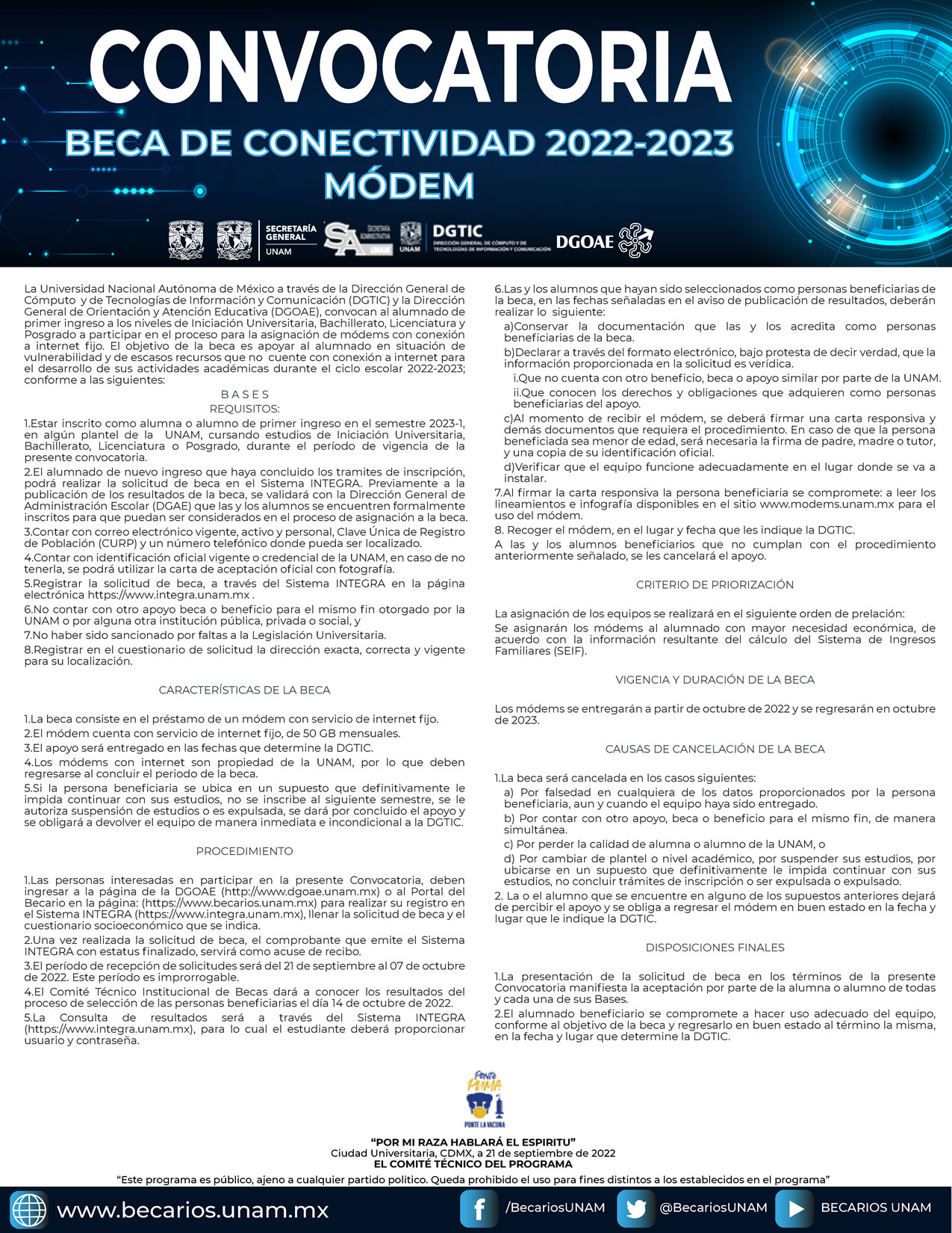 Registro de solicitudes del 21 de septiembre al 14 de octubre de 2022 en el Sistema INTEGRA: https://www.integra.unam.mx/